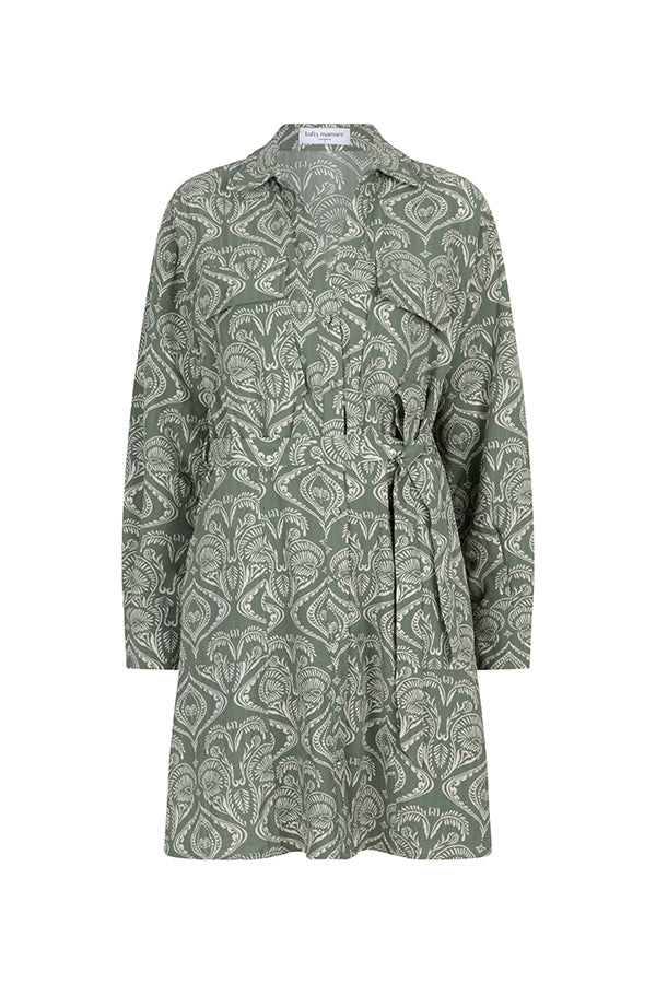 Ook zitten er borstzakjes op, en heeft een afneembare riem. De jurk valt Qua fit recht vallend en heeft knoopjes aan de mouwuiteinden.