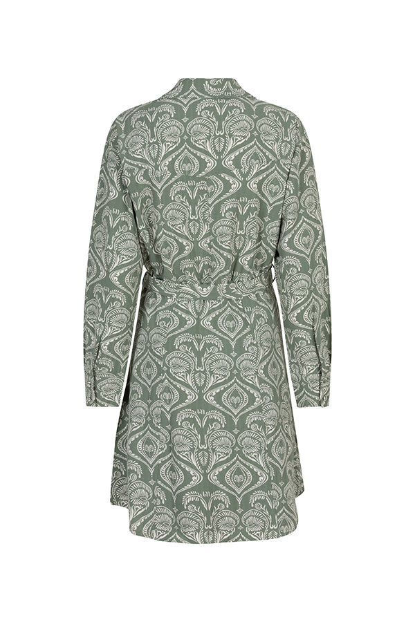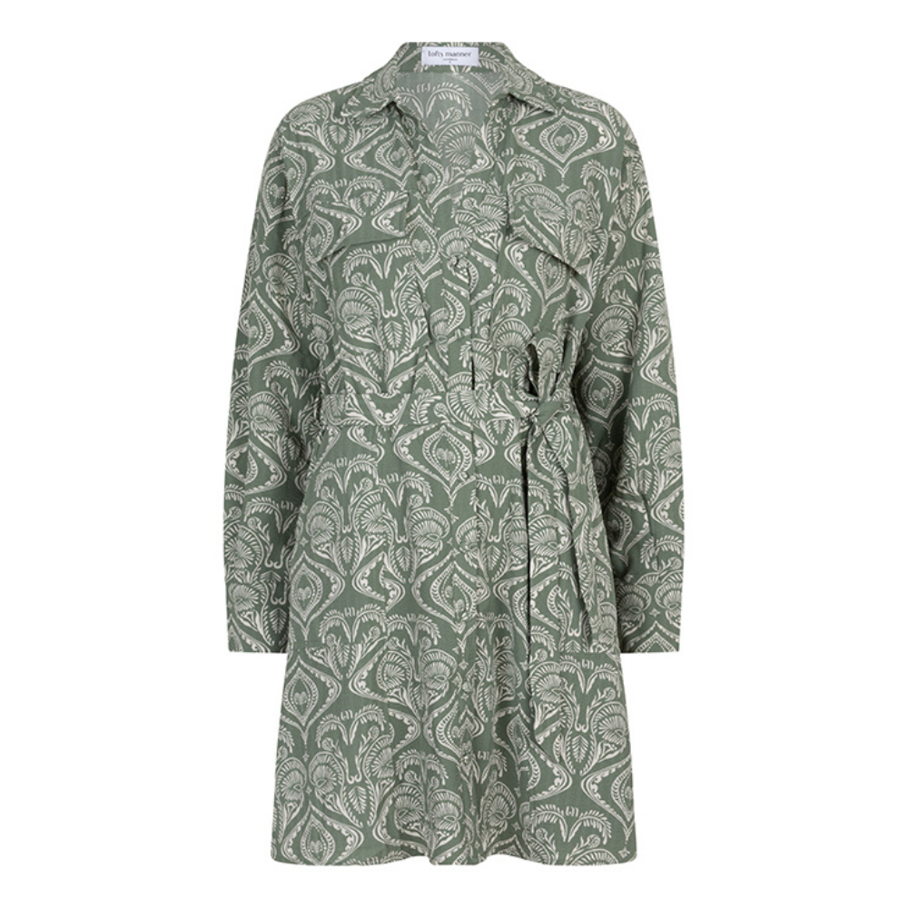 Het is een korte jurk in een mooie zachte groene kleur. Met de klassieke kraag en knoopjes van boven naar beneden is dit een fijn draagbaar jurkje.