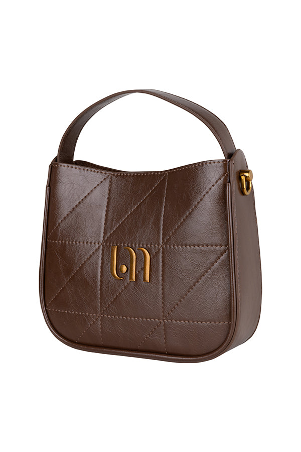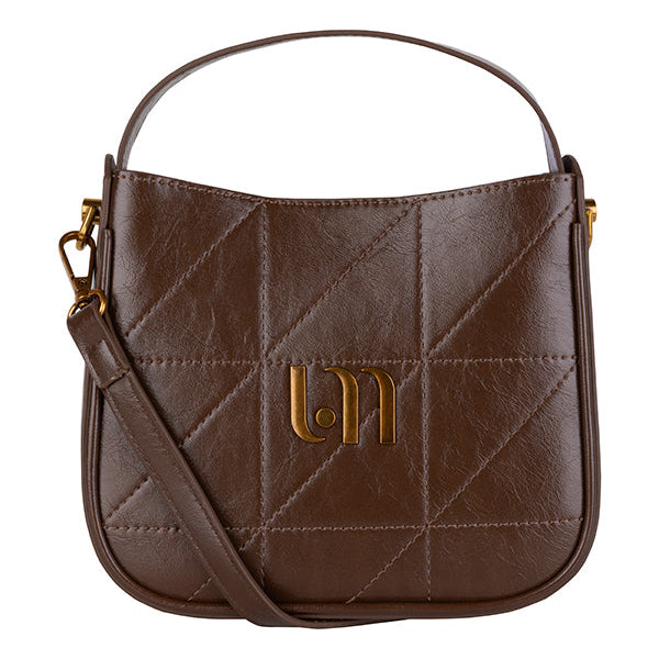 Lofty Manner Tas Yvi is een donkerbruine tas met patroon. De bruine handtas heeft zowel een kort als lang hengsel en een gouden Lofty Manner monogram op de voorkant.