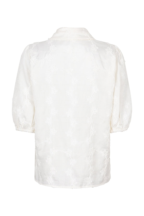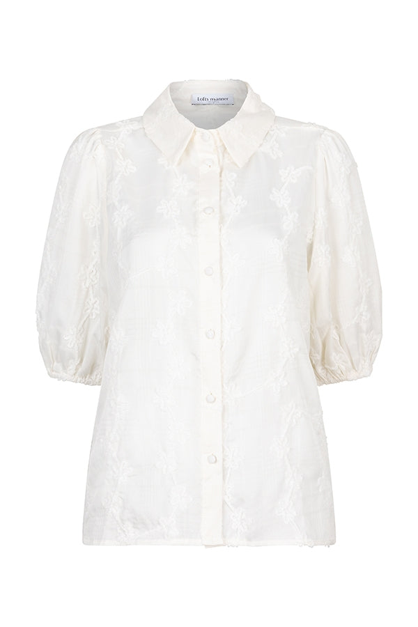 Op de blouse zit een geborduurd bloemenpatroon dat over de gehele blouse zit. De kraag van de blouse is klasiek en het item heeft over de gehele lengte knopen. toffe pofmouwen en qua pasvorm een recht model.