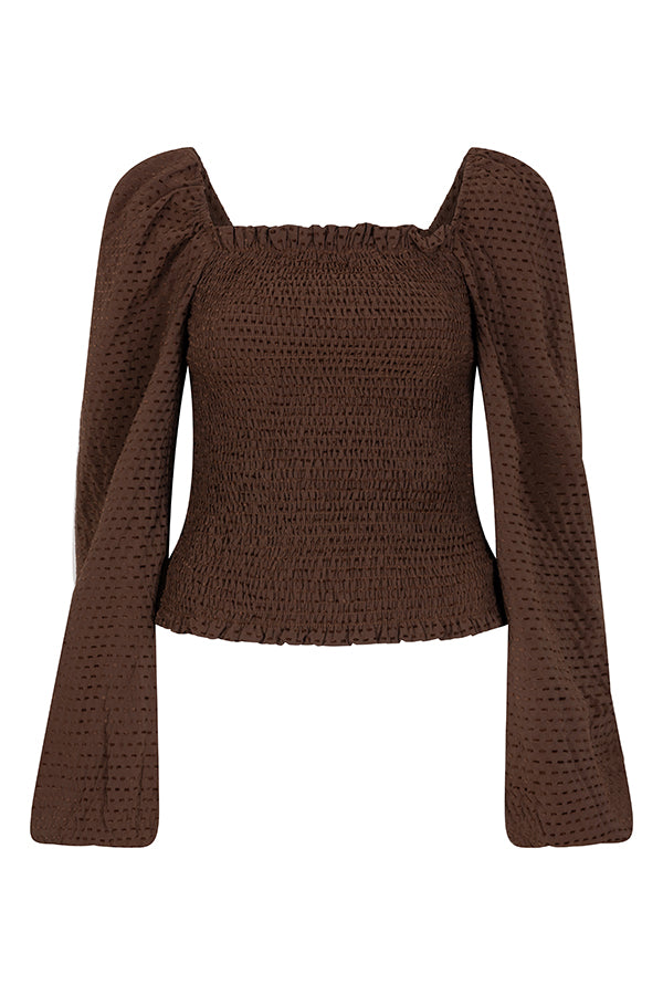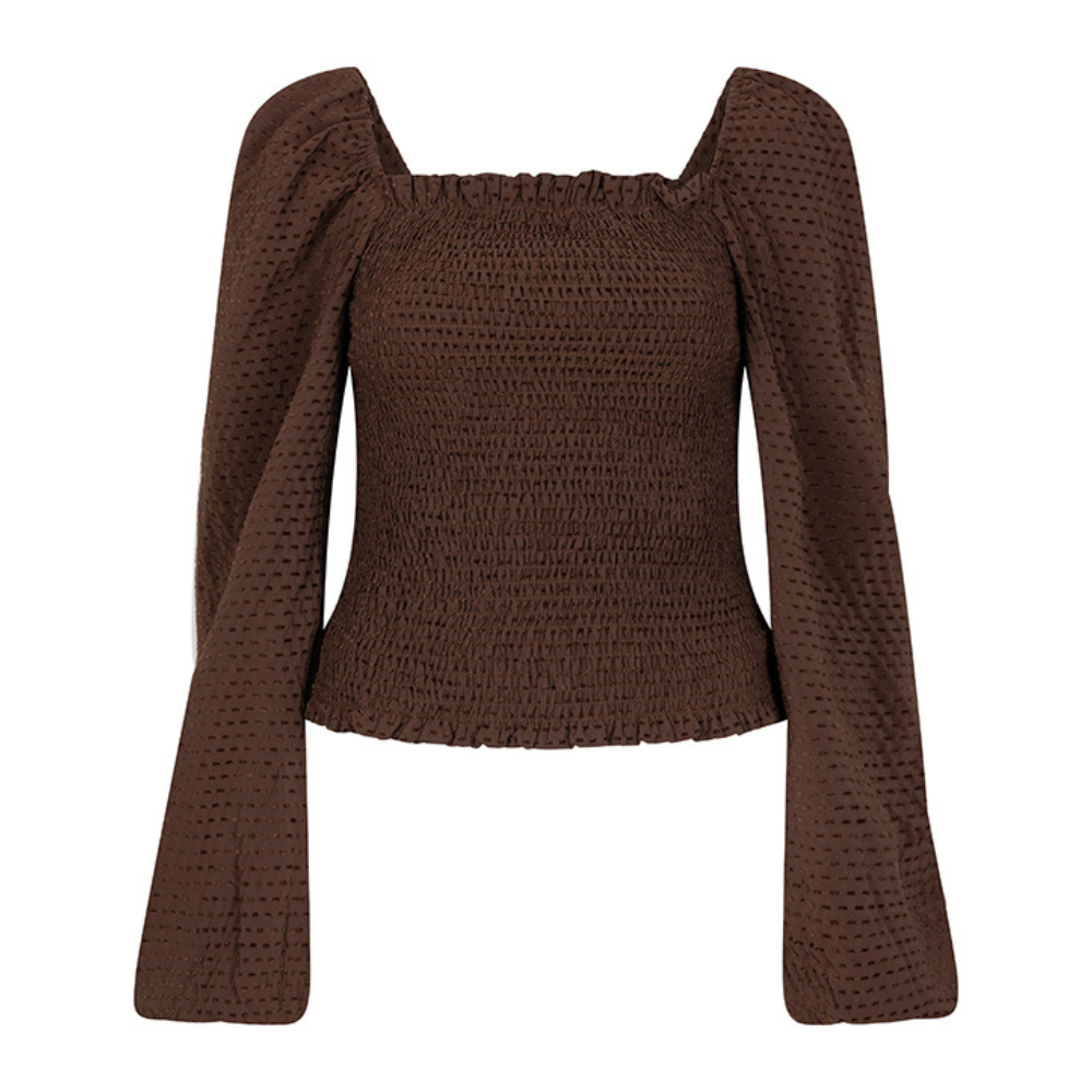De warme bruine blouse draagt aangesloten en heeft smock details op het lijfje. Ook heeft de blouse subtiele pofmouwen met een mooi detail in de stof en het een rechte hals.