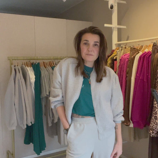 Jacket Alvee is een licht grijs jasje met ronde hals en ritssluiting.