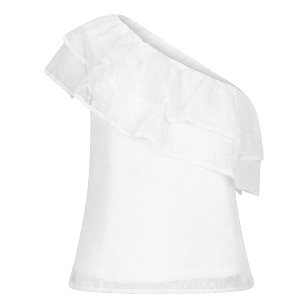 Top Indira is een witte asymmetrische zomerse off schouder top die je moeiteloos overal mee kan combineren.