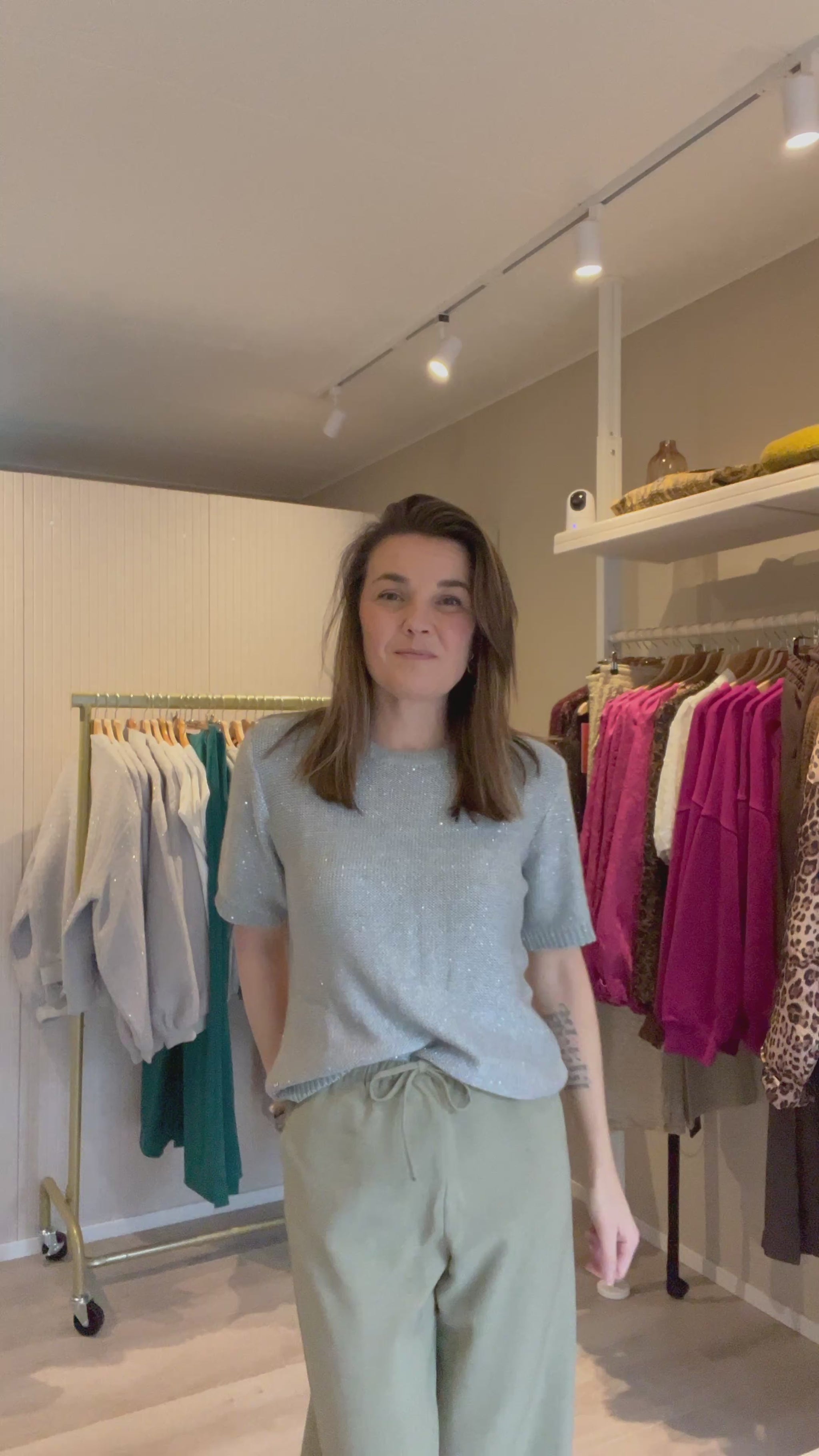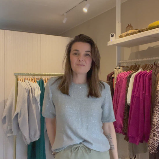 De stof heeft een subtiele glans door het pailletten detail. Hij voelt zacht aan en valt los om het lichaam. Super fijn te combineren met alle items van deze collectie.