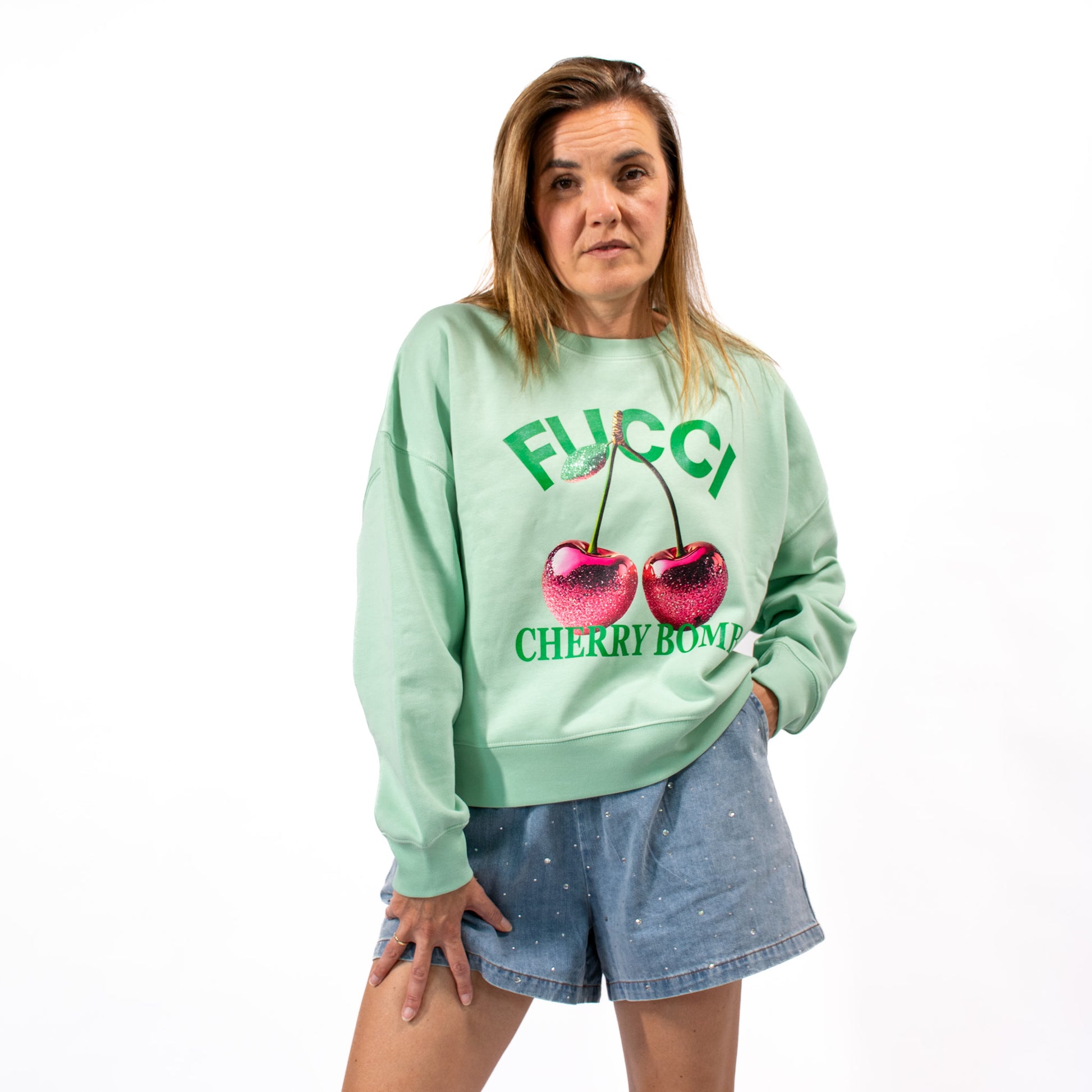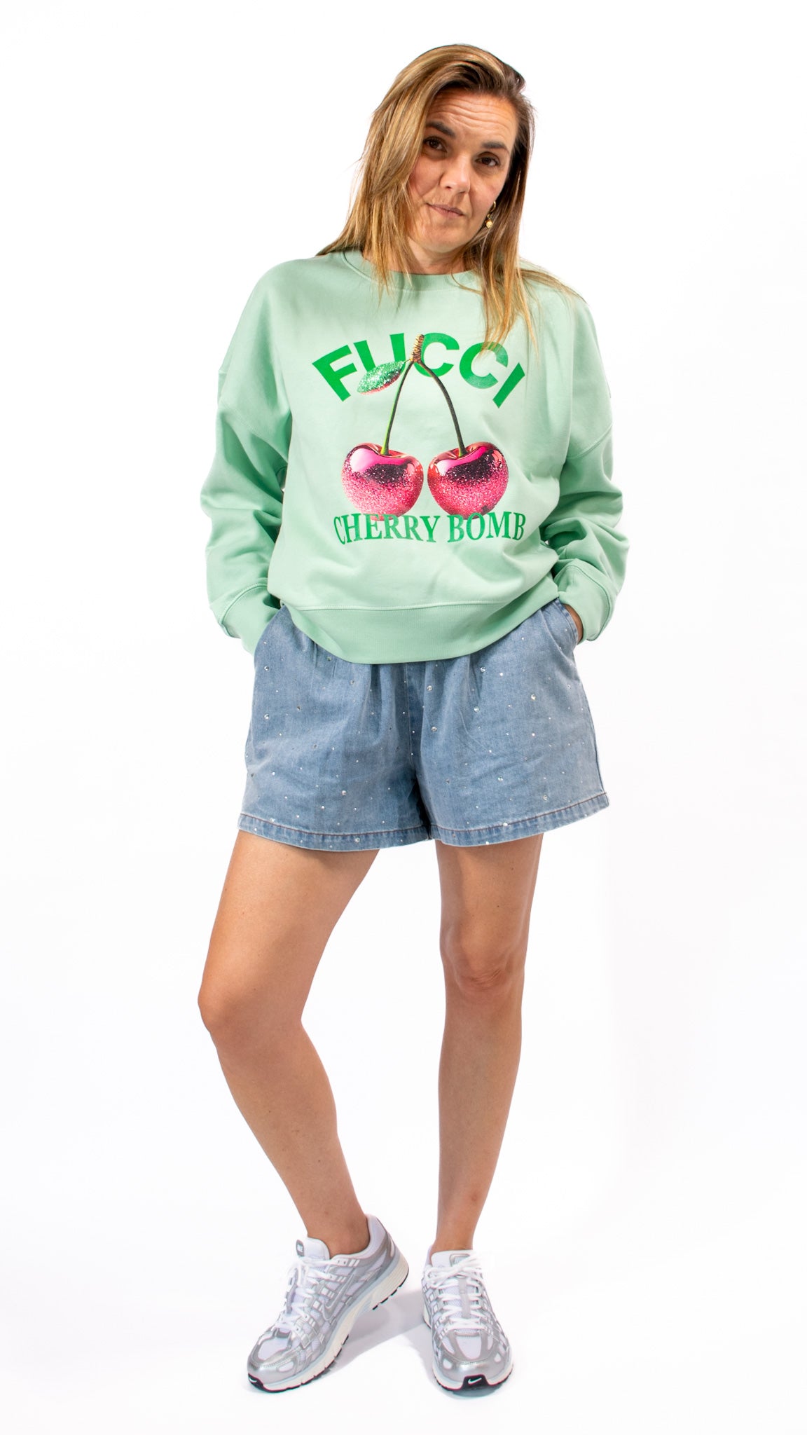 De PiNNED by K Sweater Fucci Cherry Bomb. Een must-have item die elke garderobe opvrolijkt! Deze mintgroene sweater is niet alleen een echte eyecatcher, maar biedt ook ultiem comfort dankzij het zachte katoen. Met een ronde hals en een unieke print op de voorkant, is deze sweater perfect voor zowel casual als trendy outfits.