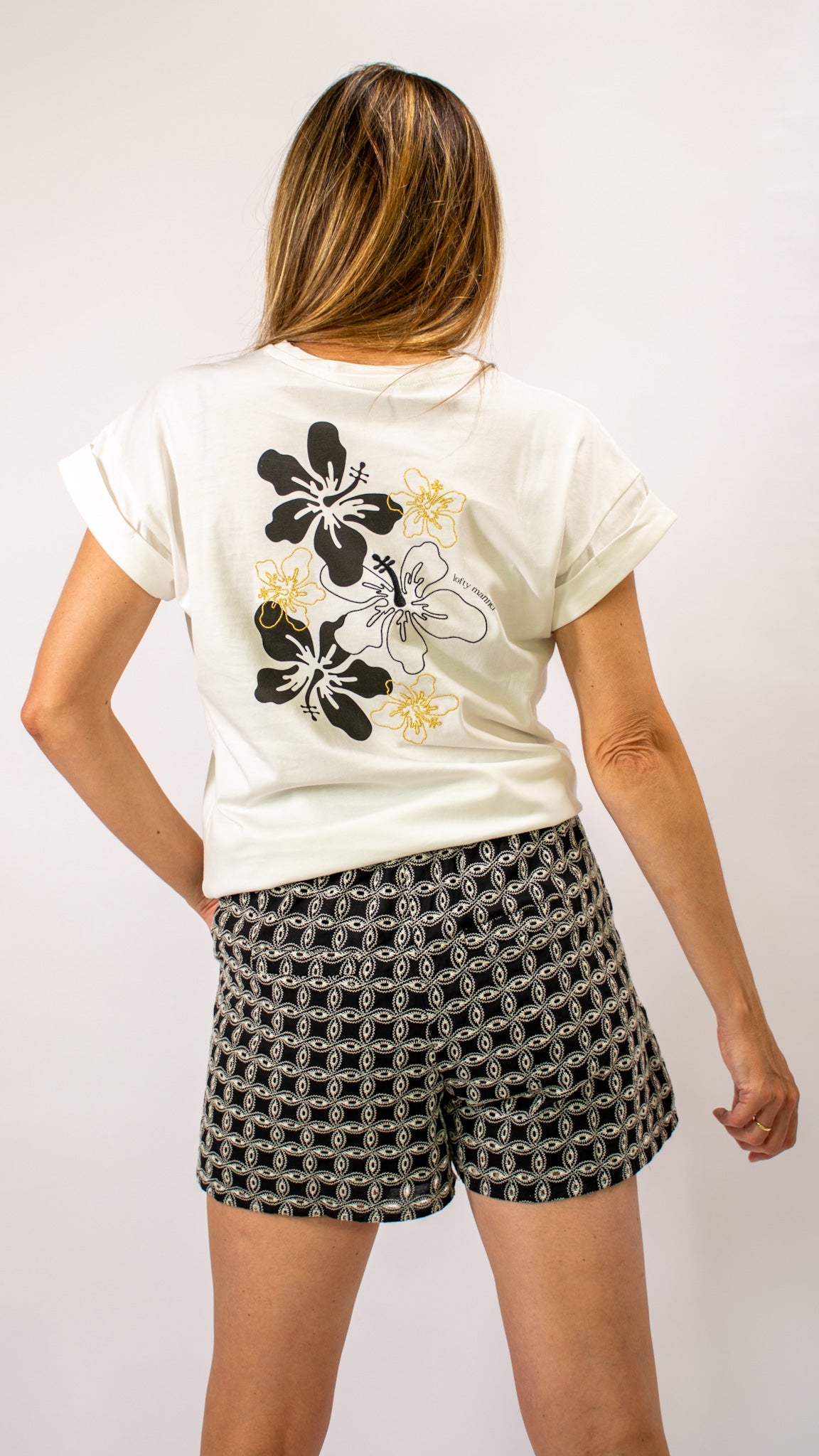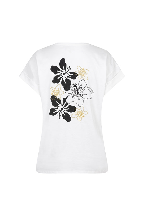 Dit item is van 100% katoen en heeft omgeslagen mouwtjes. Op de achterkant van het shirt staat een mooie backprint in Hawai style in het zwart en goud. Deze print is deels gedrukt en deels geborduurd. Op de voorkant staat ook nog een leuk detail op de borst.
